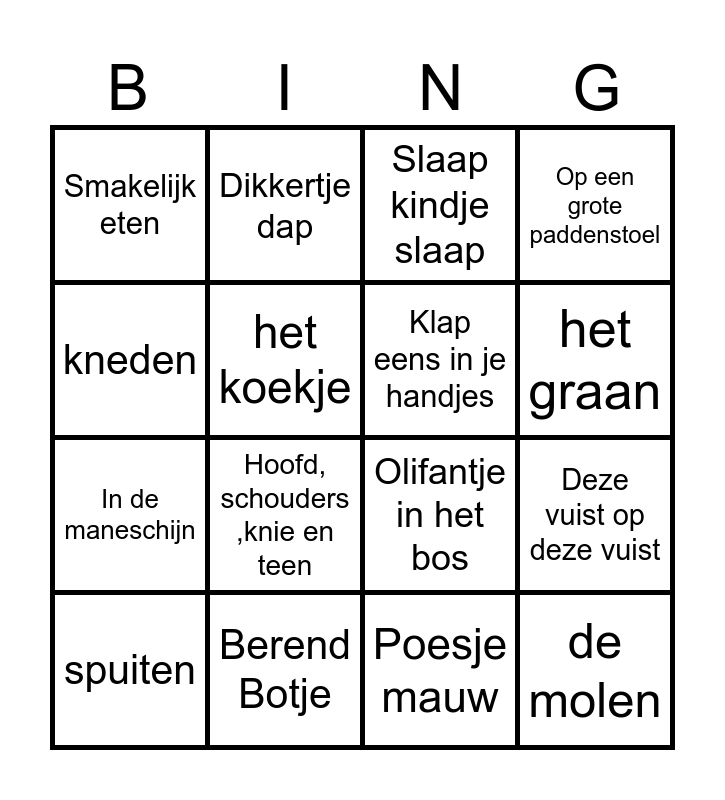 This bingo card has 25 words: Ik zag 2 beren, De wielen van de bus, Olifantje in het bos, Alle eendjes zwemmen in het water, Smakelijk eten, Dikkertje dap, Slaap kindje slaap, Op een grote paddenstoel, In de maneschijn, Hoofd, schouders ,knie en teen, Poesje mauw, Deze vuist op deze vuist, Pinguïn dans, Berend Botje, Klap eens in je handjes, Zo gaat de molen, spuiten, het koekje, de spatel, de molen, kneden, de trechter, eten, het graan and de tarwe.