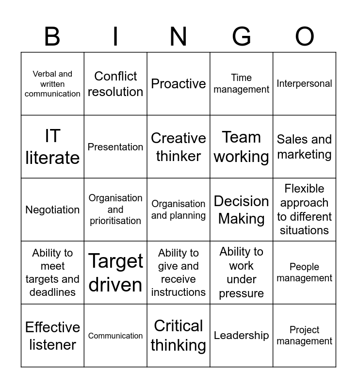 This bingo card has 30 words: Communication, Accuracy and attention to details, Organisation and prioritisation, Problem analysis, use of judgement and ability to solve problems efficiently, Verbal and written communication, Proactive, Presentation, Ability to give and receive instructions, Decision Making, Critical thinking, Flexible approach to different situations, Organisation and planning, Leadership, Project management, Sales and marketing, Customer Service, Ability to work under pressure, Ability to meet targets and deadlines, Target driven, Interpersonal, Negotiation, Delegation, Conflict resolution, Team working, IT literate, Time management, People management, Effective listener, Creative thinker and Multi –tasker.
