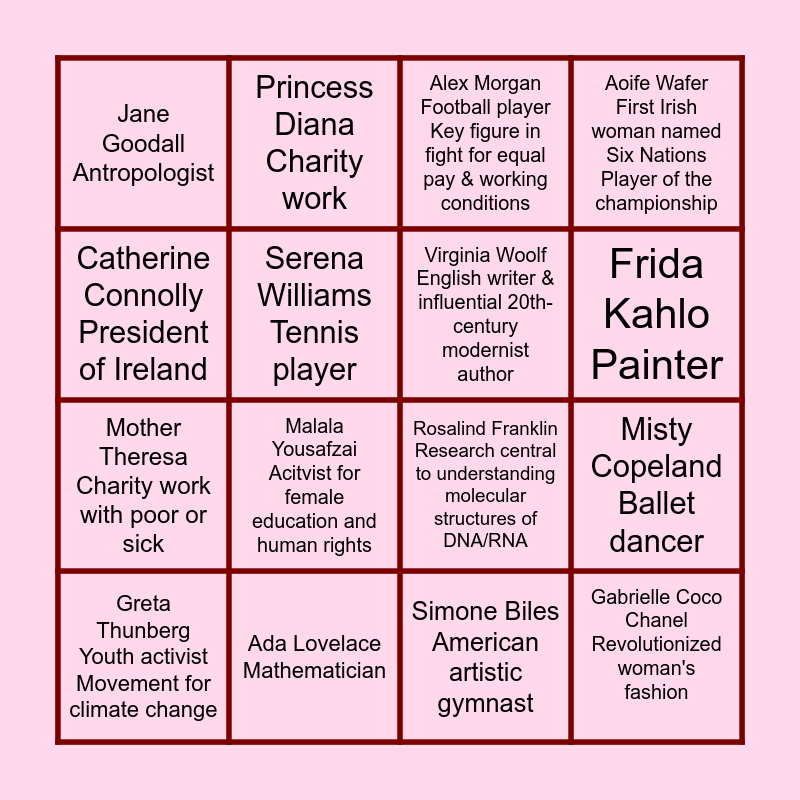This bingo card has 24 words: Taylor Swift Singer, Rosa Parks Civil rights activist, Frida Kahlo Painter, Marie Curie Scientist, Catherine Connolly President of Ireland, Jane Goodall Antropologist, Serena Williams Tennis player, Princess Diana Charity work, Ada Lovelace Mathematician, Florence Nightingale Founder of modern nursing, Mother Theresa Charity work with poor or sick, Rosalind Franklin Research central to understanding molecular structures of DNA/RNA, Mary Wollstonecraft Writer/Philosopher, modern feminism, Jane Austen Brilliant writer, Virginia Woolf English writer & influential 20th-century modernist author, Amelia Earhart American aviator, Simone Biles American artistic gymnast, Alex Morgan Football player Key figure in fight for equal pay & working conditions, Malala Yousafzai Acitvist for female education and human rights, Misty Copeland Ballet dancer, Greta Thunberg Youth activist Movement for climate change, Gabrielle Coco Chanel Revolutionized woman's fashion, Aoife Wafer First Irish woman named Six Nations Player of the championship and Joan of arc Patron saint of France, honored as a defender of the French nation.