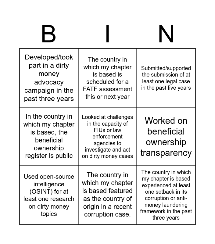 This bingo card has a free space and 8 words: Worked on beneficial ownership transparency, Submitted/supported the submission of at least one legal case in the past five years, The country in which my chapter is based is scheduled for a FATF assessment this or next year, Used open-source intelligence (OSINT) for at least one research on dirty money topics, Developed/took part in a dirty money advocacy campaign in the past three years, The country in which my chapter is based experienced at least one setback in its corruption or anti-money laundering framework in the past three years, In the country in which my chapter is based, the beneficial ownership register is public and The country in which my chapter is based featured as the country of origin in a recent corruption case..