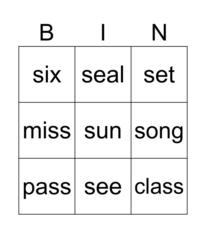 This bingo card has 10 words: see, set, six, sun, miss, pass, seal, best, song and class.