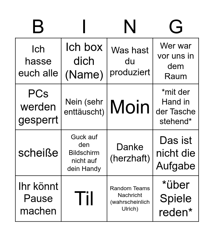 This bingo card has 16 words: Til, Das ist nicht die Aufgabe, Was hast du produziert, Ich hasse euch alle, scheiße, Ich box dich (Name), Danke (herzhaft), Random Teams Nachricht (wahrscheinlich Ulrich), PCs werden gesperrt, Nein (sehr enttäuscht), Ihr könnt Pause machen, Wer war vor uns in dem Raum, Guck auf den Bildschirm nicht auf dein Handy, *mit der Hand in der Tasche stehend*, Moin and *über Spiele reden*.