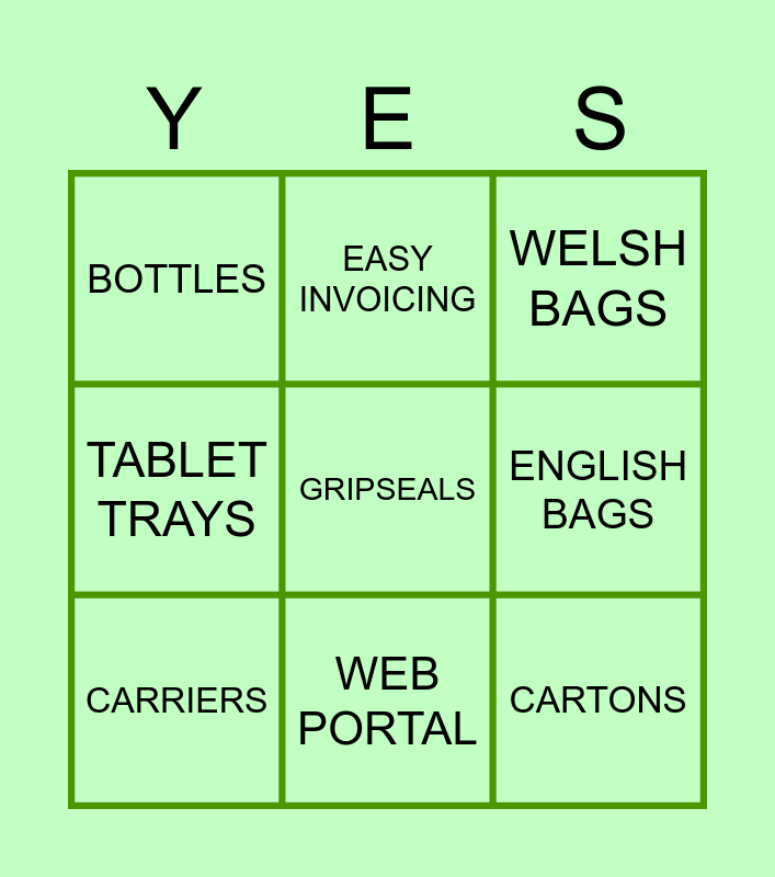 This bingo card has a free space and 8 words: ENGLISH BAGS, WELSH BAGS, EASY INVOICING, CARRIERS, BOTTLES, CARTONS, TABLET TRAYS and WEB PORTAL.