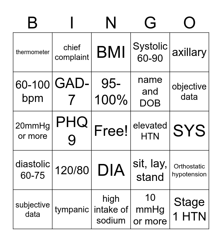 This bingo card has a free space and 24 words: 120/80, tympanic, 95-100%, subjective data, axillary, thermometer, 60-100 bpm, chief complaint, elevated HTN, DIA, name and DOB, 20mmHg or more, sit, lay, stand, Orthostatic hypotension, GAD-7, 10 mmHg or more, SYS, BMI, objective data, PHQ 9, Stage 1 HTN, diastolic 60-75, Systolic 60-90 and high intake of sodium.
