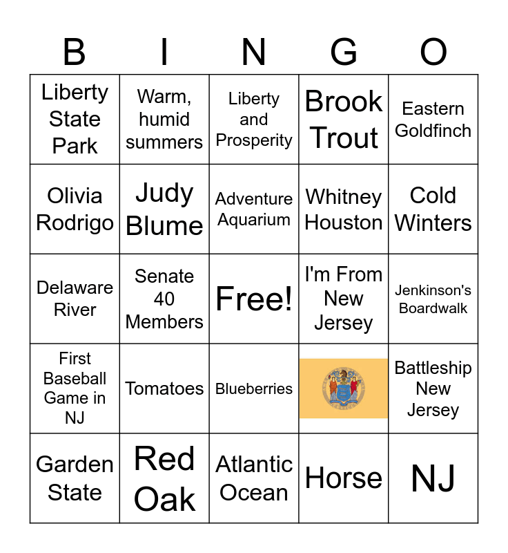 This bingo card has 1 images, a free space and 43 words: 3rd, NJ, December 18, 1787, Garden State, Trenton, Horse, Liberty and Prosperity, Violet, Eastern Goldfinch, Red Oak, Brook Trout, I'm From New Jersey, Blueberries, Tomatoes, Corn, Atlantic Ocean, Pine Barrens, Delaware River, Hudson River, Cold Winters, Warm, humid summers, Atlantic City Boardwalk, Cape May Lighthouse, Liberty State Park, Cape May Zoo, Jenkinson's Boardwalk, Six Flags Great Adventure, About 9.5 million people, First Baseball Game in NJ, More diners than any other state, Battleship New Jersey, State House, Honeybee, Senate 40 Members, General Assembly 80 Members, Princeton University, Jersey Shore, Adventure Aquarium, Olivia Rodrigo, Whitney Houston, Bruce Springsteen, Judy Blume and Derek Jeter.