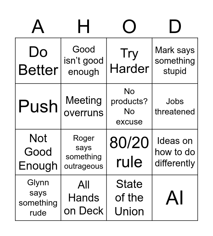 This bingo card has 16 words: All Hands on Deck, Ideas on how to do differently, Try Harder, Do Better, Not Good Enough, Good isn’t good enough, 80/20 rule, State of the Union, Push, Meeting overruns, Glynn says something rude, Mark says something stupid, Roger says something outrageous, Jobs threatened, No products? No excuse and AI.