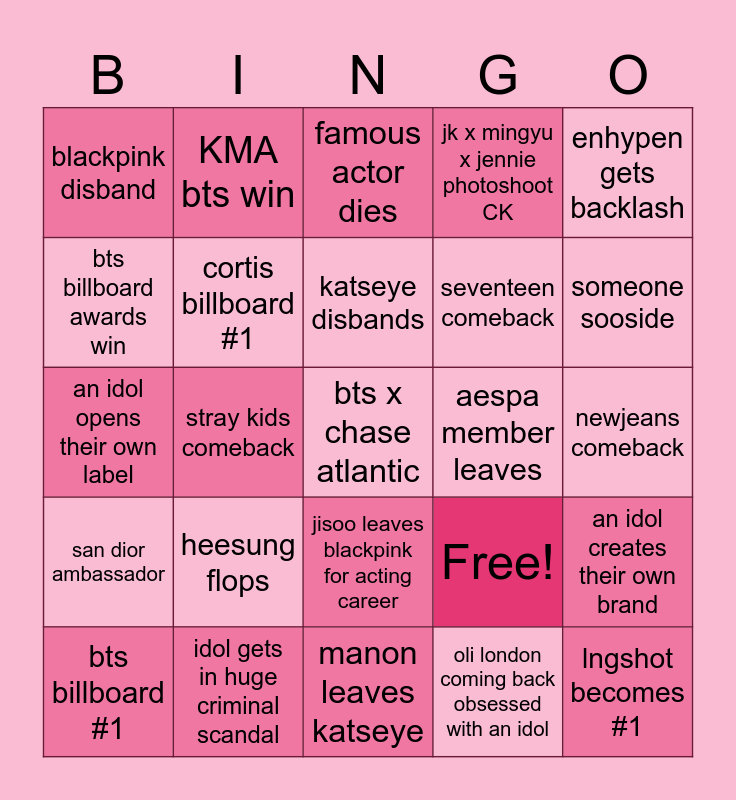 This bingo card has 25 words: heesung flops, manon leaves katseye, katseye disbands, bts billboard #1, enhypen gets backlash, blackpink disband, bts billboard awards win, KMA bts win, aespa member leaves, jisoo leaves blackpink for acting career, seventeen comeback, an idol opens their own label, Free!, an idol creates their own brand, cortis billboard #1, lngshot becomes #1, newjeans comeback, famous actor dies, someone sooside, stray kids comeback, bts x chase atlantic, idol gets in huge criminal scandal, san dior ambassador, jk x mingyu x jennie photoshoot CK and oli london coming back obsessed with an idol.