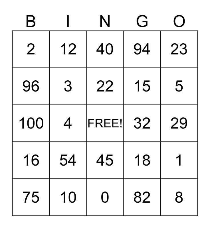 This bingo card has a free space and 24 words: 54, 10, 22, 75, 23, 2, 96, 12, 32, 45, 15, 100, 18, 1, 3, 82, 29, 40, 5, 4, 8, 16, 94 and 0.