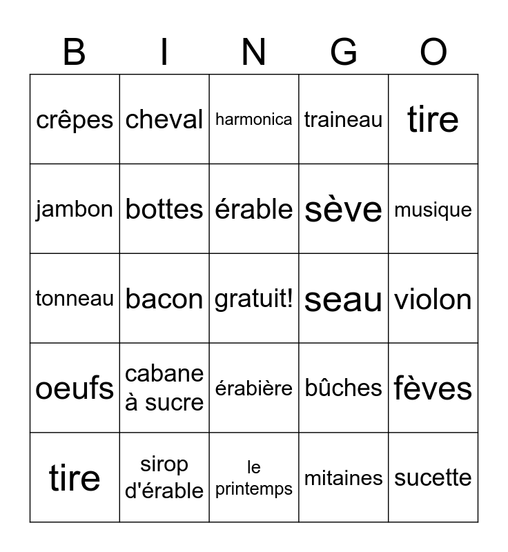 This bingo card has a free space and 24 words: cabane à sucre, sirop d'érable, érable, tire, tire, crêpes, jambon, cheval, seau, érabière, sève, tonneau, bûches, fèves, bottes, mitaines, violon, harmonica, musique, bacon, sucette, oeufs, traineau and le printemps.