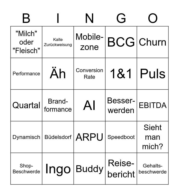 This bingo card has a free space and 24 words: Büdelsdorf, Ingo, Conversion Rate, Shop-Beschwerde, Churn, "Milch" oder "Fleisch", Performance, Kalte Zurückweisung, Besser-werden, ARPU, 1&1, Quartal, Speedboot, Sieht man mich?, Äh, Reise-bericht, EBITDA, Mobile-zone, Puls, Brand-formance, Gehalts-beschwerde, Dynamisch, BCG and Buddy.