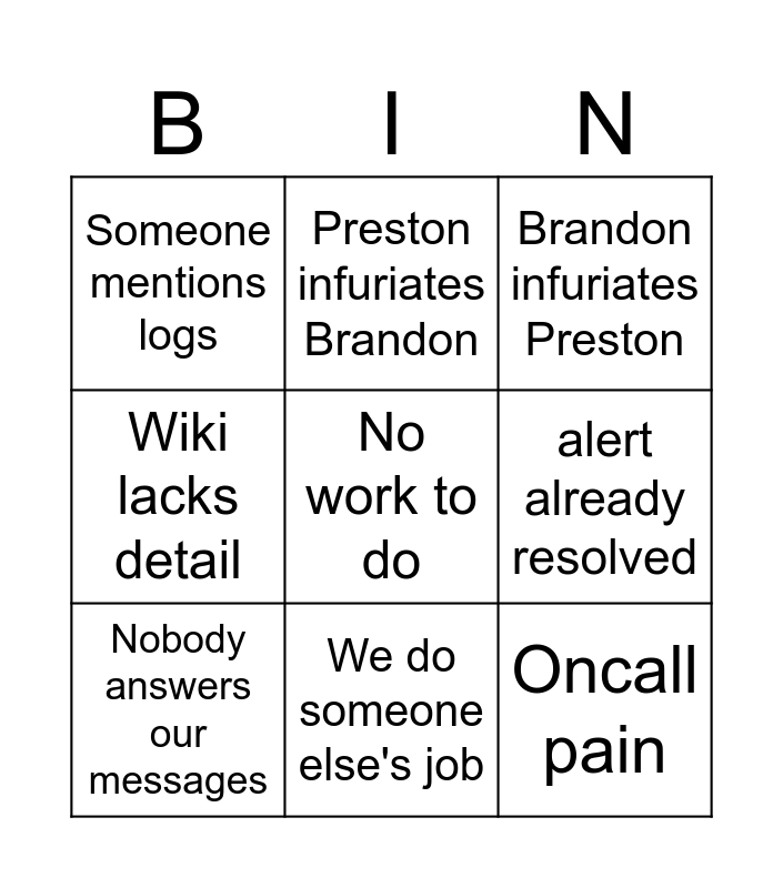 This bingo card has a free space and 8 words: alert already resolved, Brandon infuriates Preston, Preston infuriates Brandon, Nobody answers our messages, Someone mentions logs, Oncall pain, Wiki lacks detail and We do someone else's job.