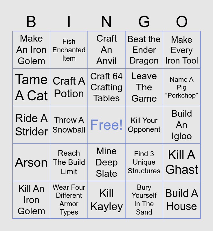 This bingo card has a free space and 24 words: Reach The Build Limit, Wear Four Different Armor Types, Craft 64 Crafting Tables, Kill An Iron Golem, Make Every Iron Tool, Make An Iron Golem, Tame A Cat, Fish Enchanted Item, Kill Your Opponent, Mine Deep Slate, Leave The Game, Ride A Strider, Find 3 Unique Structures, Kill A Ghast, Craft A Potion, Bury Yourself In The Sand, Build An Igloo, Craft An Anvil, Name A Pig “Porkchop”, Throw A Snowball, Build A House, Arson, Beat the Ender Dragon and Kill Kayley.