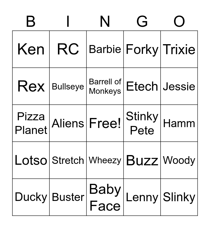 This bingo card has a free space and 24 words: Stretch, Buster, Barrell of Monkeys, Ducky, Trixie, Ken, Rex, RC, Stinky Pete, Wheezy, Etech, Pizza Planet, Buzz, Woody, Bullseye, Lenny, Hamm, Barbie, Jessie, Aliens, Slinky, Lotso, Forky and Baby Face.