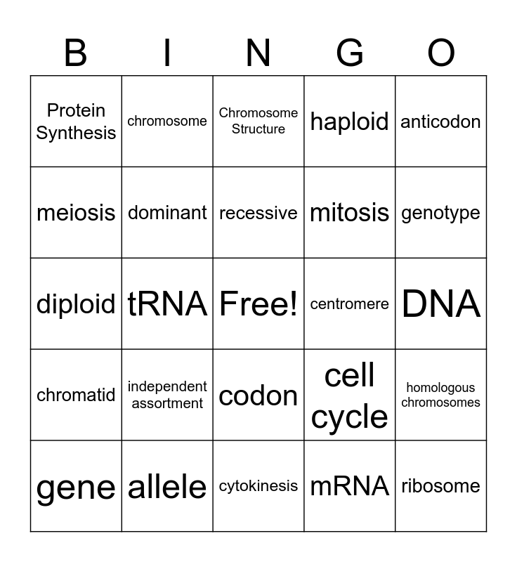 This bingo card has a free space and 27 words: cell cycle, interphase, mitosis, cytokinesis, meiosis, Chromosome Structure, chromosome, chromatid, centromere, homologous chromosomes, diploid, haploid, gene, allele, genotype, phenotype, dominant, recessive, independent assortment, Protein Synthesis, DNA, mRNA, tRNA, ribosome, codon, anticodon and mutation.