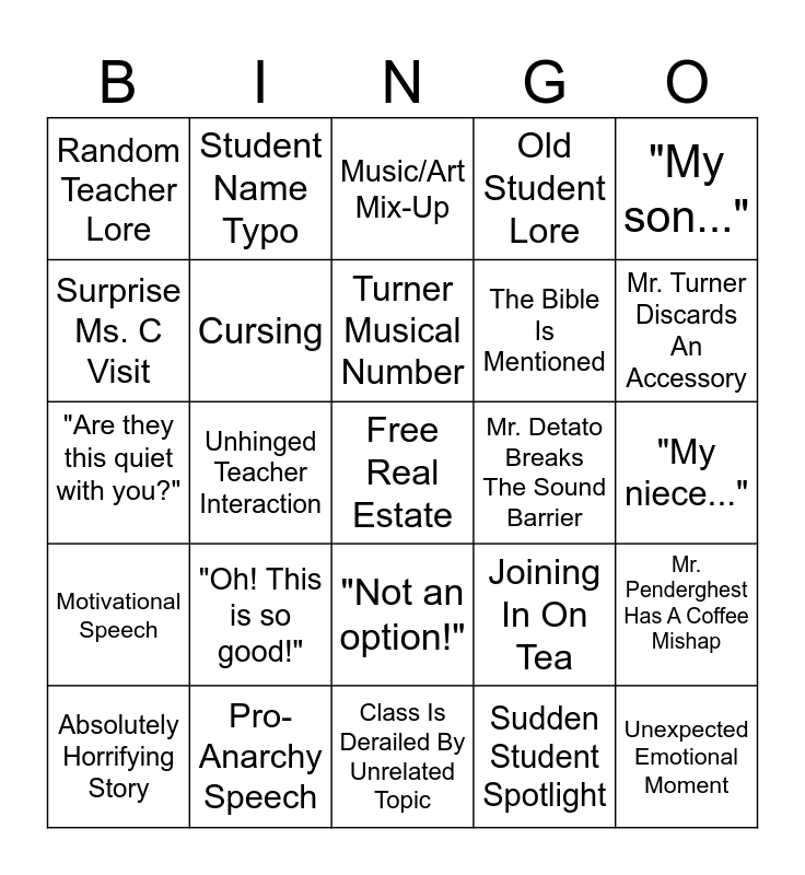 This bingo card has a free space and 24 words: "Oh! This is so good!", Pro-Anarchy Speech, Turner Musical Number, Absolutely Horrifying Story, "My son...", Random Teacher Lore, Surprise Ms. C Visit, Student Name Typo, Mr. Detato Breaks The Sound Barrier, "Not an option!", The Bible Is Mentioned, "Are they this quiet with you?", Joining In On Tea, Mr. Penderghest Has A Coffee Mishap, Cursing, Sudden Student Spotlight, "My niece...", Music/Art Mix-Up, Mr. Turner Discards An Accessory, Unhinged Teacher Interaction, Unexpected Emotional Moment, Motivational Speech, Old Student Lore and Class Is Derailed By Unrelated Topic.