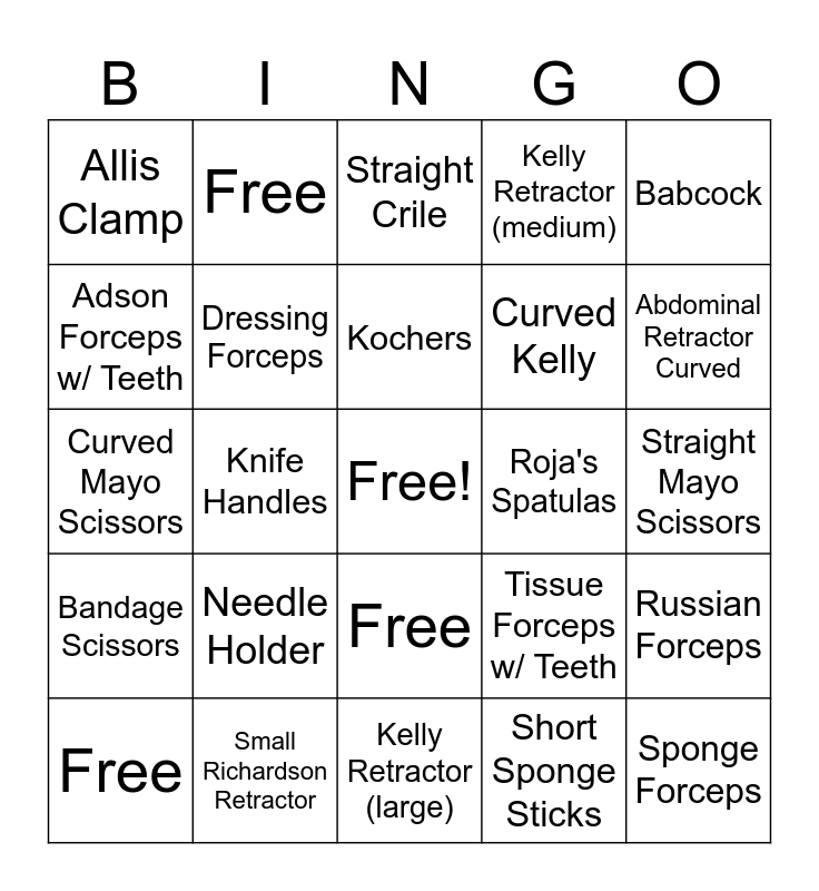 This bingo card has a free space and 24 words: Free, Needle Holder, Kochers, Short Sponge Sticks, Babcock, Allis Clamp, Free, Straight Crile, Roja's Spatulas, Straight Mayo Scissors, Curved Mayo Scissors, Dressing Forceps, Tissue Forceps w/ Teeth, Russian Forceps, Adson Forceps w/ Teeth, Small Richardson Retractor, Kelly Retractor (large), Kelly Retractor (medium), Abdominal Retractor Curved, Bandage Scissors, Knife Handles, Free, Curved Kelly and Sponge Forceps.