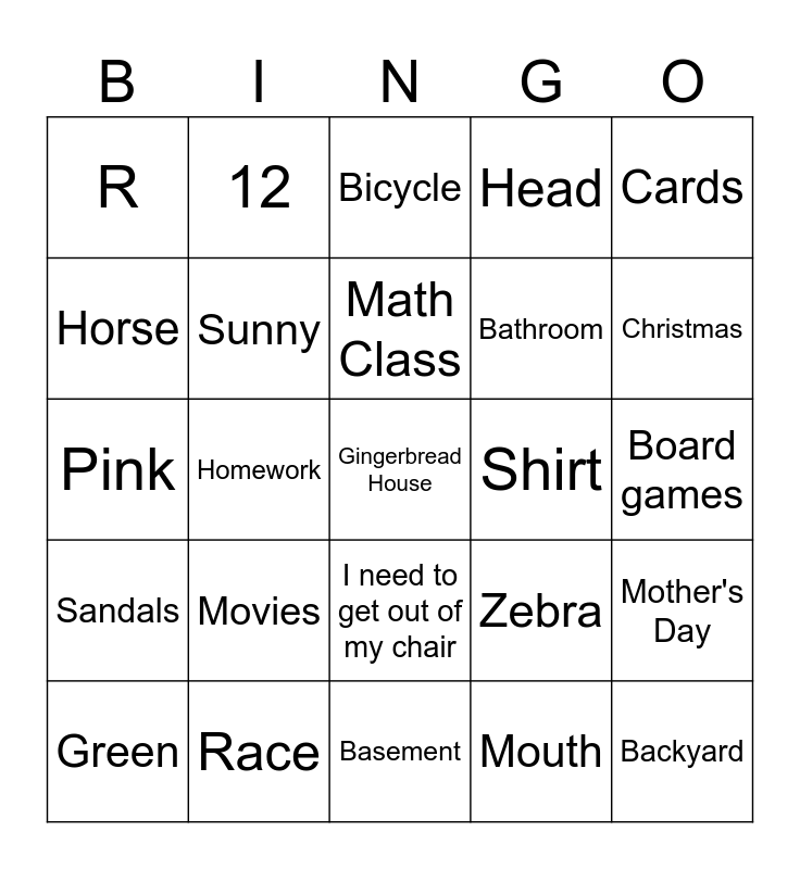 This bingo card has a free space and 24 words: Movies, Race, Math Class, Green, Cards, R, Horse, 12, Shirt, I need to get out of my chair, Bathroom, Pink, Zebra, Mother's Day, Sunny, Mouth, Board games, Bicycle, Christmas, Homework, Backyard, Sandals, Head and Basement.