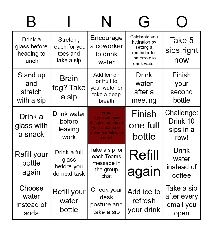 This bingo card has a free space and 24 words: Drink a full glass before you do next task, Refill your water bottle, Add lemon or fruit to your water or take a deep breath, Choose water instead of soda, Take 5 sips right now, Drink a glass before heading to lunch, Stand up and stretch with a sip, Stretch , reach for you toes and take a sip, Finish one full bottle, Take a sip for each Teams message in the group chat, Drink water after a meeting, Drink a glass with a snack, Refill again, Drink water instead of coffee, Brain fog? Take a sip, Add ice to refresh your drink, Challenge: Drink 10 sips in a row!, Encourage a coworker to drink water, Finish your second bottle, Drink water before leaving work, Take a sip after every email you open, Refill your bottle again, Celebrate you hydration by setting a reminder for tomorrow to drink water and Check your desk posture and take a sip.
