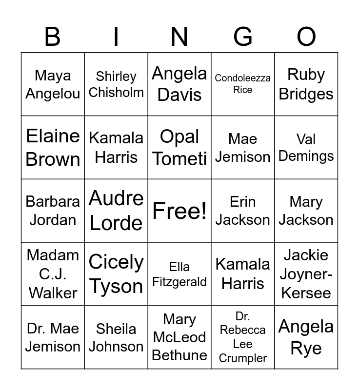 This bingo card has a free space and 75 words: Harriet Tubman, Rosa Parks, Angela Davis, Fannie Lou Hamer, Ida B. Wells, Ella Baker, Daisy Bates, Mary Church Terrell, Septima Poinsette Clark, Diane Nash, Amelia Boynton Robinson, Tarana Burke, Opal Tometi, Elaine Brown, Marsha P. Johnson, Audre Lorde, bell hooks, Angela Rye, Recy Taylor, Ruby Bridges, Betty Shabazz, Barbara Jordan, Kamala Harris, Shirley Chisholm, Condoleezza Rice, Michelle Obama, Ketanji Brown Jackson, Loretta Lynch, Stacey Abrams, Carol Moseley Braun, Susan Rice, Andrea Jenkins, Muriel Bowser, Kamala Harris, Val Demings, Mae Jemison, Katherine Johnson, Dorothy Vaughan, Mary Jackson, Dr. Rebecca Lee Crumpler, Dr. Kizzmekia Corbett, Dr. Patricia Bath, Bessie Coleman, Dr. Mae Jemison, Dr. Alexa Canady, Dr. Shirley Ann Jackson, Dr. Mae Jemison, Maya Angelou, Toni Morrison, Nina Simone, Zora Neale Hurston, Ella Fitzgerald, Misty Copeland, Oprah Winfrey, Beyoncé, Josephine Baker, Sister Rosetta Tharpe, Aretha Franklin, Maya Angelou, Toni Morrison, Cicely Tyson, Viola Davis, Serena Williams, Simone Biles, Lisa Leslie, Erin Jackson, Florence Griffith Joyner, Wilma Rudolph, Gabby Douglas, Jackie Joyner-Kersee, Madam C.J. Walker, Sheila Johnson, Marian Wright Edelman, Mary McLeod Bethune and Byllye Avery.