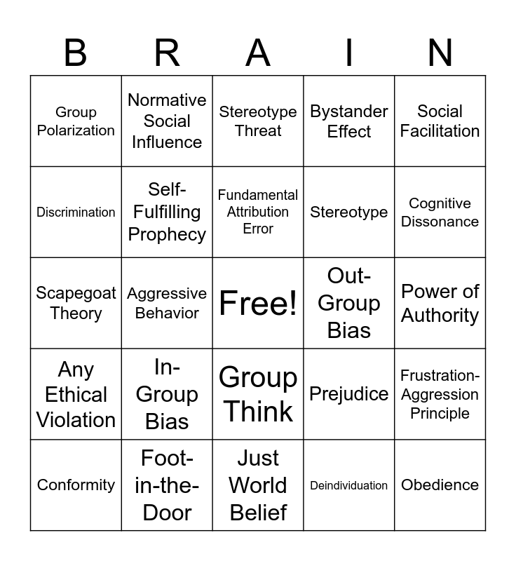 This bingo card has a free space and 24 words: In-Group Bias, Foot-in-the-Door, Fundamental Attribution Error, Conformity, Social Facilitation, Group Polarization, Discrimination, Normative Social Influence, Out-Group Bias, Group Think, Stereotype, Scapegoat Theory, Prejudice, Frustration-Aggression Principle, Self-Fulfilling Prophecy, Deindividuation, Power of Authority, Stereotype Threat, Cognitive Dissonance, Aggressive Behavior, Obedience, Any Ethical Violation, Bystander Effect and Just World Belief.