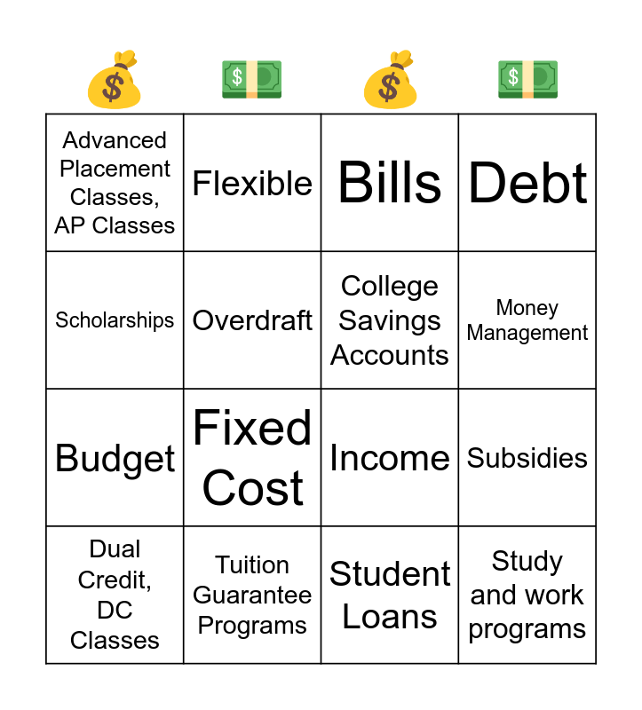 This bingo card has 16 words: Tuition Guarantee Programs, Subsidies, Bills, Advanced Placement Classes, AP Classes, Budget, Flexible, Income, Student Loans, Scholarships, Overdraft, Dual Credit, DC Classes, Debt, Fixed Cost, Money Management, College Savings Accounts and Study and work programs.