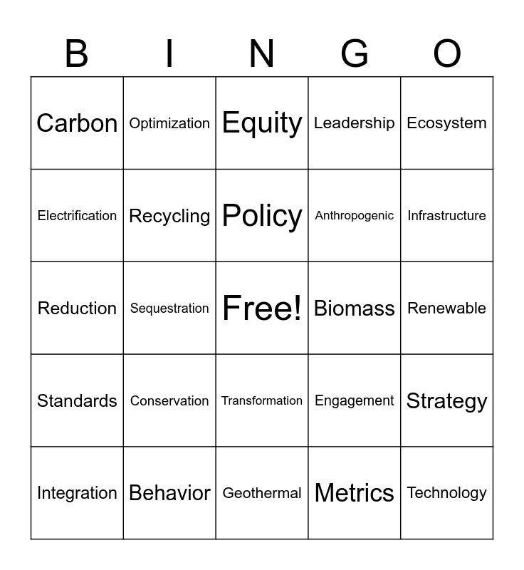 This bingo card has a free space and 79 words: Solar, Waste, Equity, Reuse, Biodiversity, Greenwashing, Efficiency, Habitat, Mitigation, Energy, Circular, Compost, Leadership, Carbon, Transition, Electrification, Footprint, Conservation, Climate, Renewable, Reporting, Ecosystem, Reduction, Policy, Recycling, Community, Hydro, Resilience, Planning, Emissions, Infrastructure, Innovation, Geothermal, Justice, Integration, Biomass, Assessment, Stewardship, Adaptation, Technology, Diversion, Lifecycle, Storage, Impact, Governance, Optimization, Compliance, Certification, Grid, Regulation, Strategy, Sequestration, Engagement, Landfill, Indicators, Ethics, Systems, Responsibility, Regeneration, Transformation, Anthropogenic, Preservation, Circularity, Implementation, Evaluation, Consumption, Wind, Neutrality, Procurement, Standards, Behavior, Restoration, Sourcing, Longevity, Collaboration, Metrics, Inclusion, Decarbonization and Sustainability.