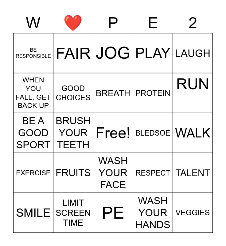This bingo card has a free space and 29 words: SMILE, HONESTY, BRUSH YOUR TEETH, FUN WITH FAMILY, BE RESPONSIBLE, JOG, GOOD CHOICES, FRUITS, BLEDSOE, LIMIT SCREEN TIME, WALK, VEGGIES, PE, WASH YOUR HANDS, RUN, INTEGRITY, WASH YOUR FACE, EXERCISE, LAUGH, BE A GOOD SPORT, RESPECT, WATER, PROTEIN, WHEN YOU FALL, GET BACK UP, PLAY, FAIR, TALENT, BREATH and TRY YOUR BEST.