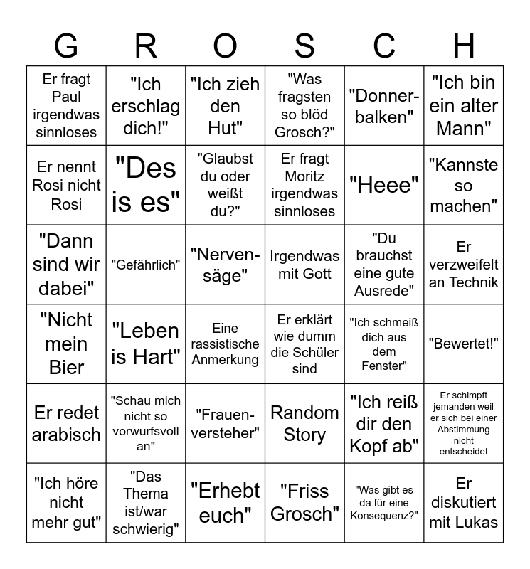 This bingo card has 36 words: Random Story, "Frauen- versteher", "Friss Grosch", Er nennt Rosi nicht Rosi, "Nicht mein Bier, Irgendwas mit Gott, "Des is es", "Erhebt euch", "Donner-balken", "Ich reiß dir den Kopf ab", "Kannste so machen", "Was fragsten so blöd Grosch?", Er schimpft jemanden weil er sich bei einer Abstimmung nicht entscheidet, "Gefährlich", Er fragt Moritz irgendwas sinnloses, Er fragt Paul irgendwas sinnloses, Er redet arabisch, "Du brauchst eine gute Ausrede", "Dann sind wir dabei", "Ich zieh den Hut", "Nerven-säge", "Leben is Hart", Er erklärt wie dumm die Schüler sind, Eine rassistische Anmerkung, "Ich schmeiß dich aus dem Fenster", "Ich erschlag dich!", "Heee", "Das Thema ist/war schwierig", "Glaubst du oder weißt du?", "Ich bin ein alter Mann", Er diskutiert mit Lukas, "Ich höre nicht mehr gut", "Bewertet!", Er verzweifelt an Technik, "Schau mich nicht so vorwurfsvoll an" and "Was gibt es da für eine Konsequenz?".