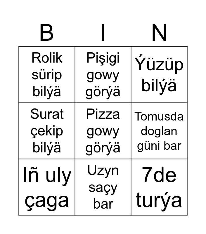 This bingo card has a free space and 8 words: Tomusda doglan güni bar, Ýüzüp bilýä, Pişigi gowy görýä, Iñ uly çaga, Rolik sürip bilýä, 7de turýa, Surat çekip bilýä and Uzyn saçy bar.