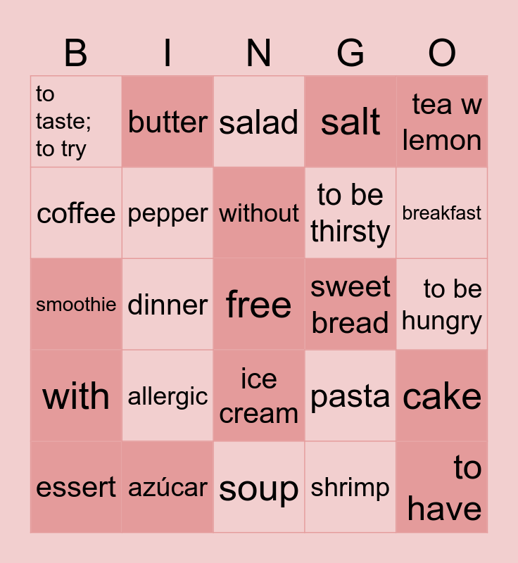 This bingo card has a free space and 24 words: essert, allergic, without, shrimp, tea w lemon, to taste; to try, butter, salad, sweet bread, to be hungry, smoothie, pepper, pasta, cake, coffee, azúcar, soup, salt, breakfast, with, dinner, ice cream, to be thirsty and to have.