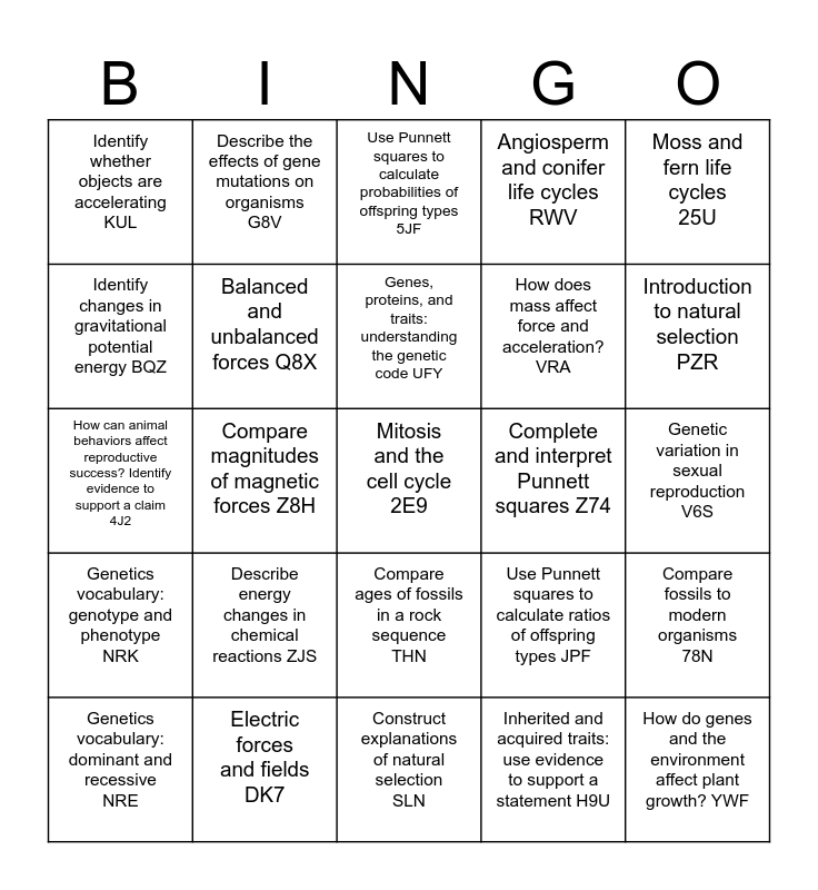 This bingo card has a free space and 24 words: Describe energy changes in chemical reactions ZJS, Electric forces and fields DK7, Genes, proteins, and traits: understanding the genetic code UFY, Genetics vocabulary: dominant and recessive NRE, Moss and fern life cycles 25U, Identify whether objects are accelerating KUL, Identify changes in gravitational potential energy BQZ, Describe the effects of gene mutations on organisms G8V, Complete and interpret Punnett squares Z74, Compare ages of fossils in a rock sequence THN, How does mass affect force and acceleration? VRA, How can animal behaviors affect reproductive success? Identify evidence to support a claim 4J2, Use Punnett squares to calculate ratios of offspring types JPF, Compare fossils to modern organisms 78N, Balanced and unbalanced forces Q8X, Inherited and acquired traits: use evidence to support a statement H9U, Genetic variation in sexual reproduction V6S, Use Punnett squares to calculate probabilities of offspring types 5JF, Introduction to natural selection PZR, Compare magnitudes of magnetic forces Z8H, How do genes and the environment affect plant growth? YWF, Genetics vocabulary: genotype and phenotype NRK, Angiosperm and conifer life cycles RWV and Construct explanations of natural selection SLN.