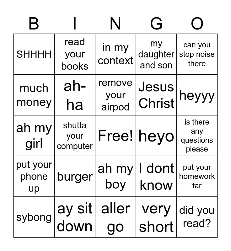 This bingo card has a free space and 24 words: burger, ay sit down, remove your airpod, sybong, can you stop noise there, SHHHH, much money, read your books, heyo, ah my boy, Jesus Christ, ah my girl, I dont know, put your homework far, ah-ha, very short, is there any questions please, in my context, heyyy, shutta your computer, did you read?, put your phone up, my daughter and son and aller go.