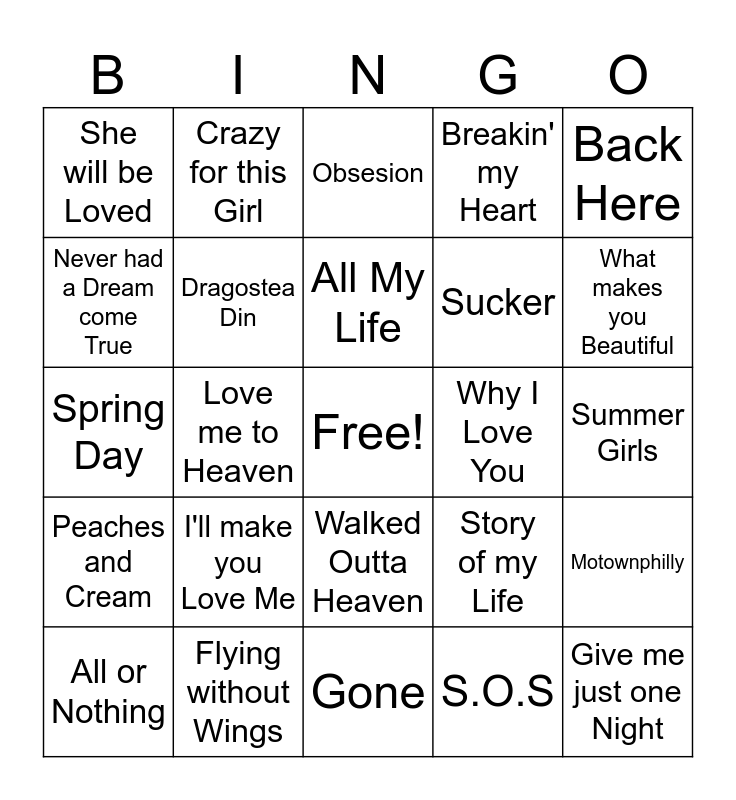 This bingo card has a free space and 24 words: I'll make you Love Me, Flying without Wings, All My Life, All or Nothing, Back Here, She will be Loved, Never had a Dream come True, Crazy for this Girl, Why I Love You, Walked Outta Heaven, Sucker, Spring Day, Story of my Life, Motownphilly, Dragostea Din, S.O.S, Summer Girls, Obsesion, What makes you Beautiful, Love me to Heaven, Give me just one Night, Peaches and Cream, Breakin' my Heart and Gone.