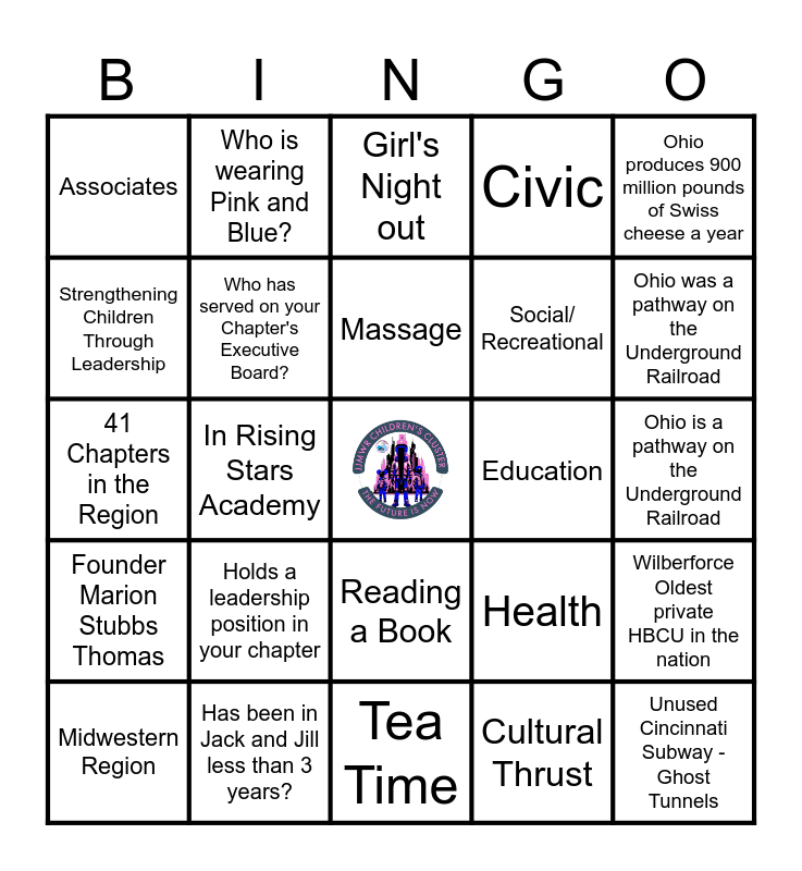 This bingo card has a free space and 64 words: 1938, Can you recite the J&J Motto?, Spa Day, Cultural Thrust, Queen City, Founded in Philadelphia, Who is wearing Pink and Blue?, Bubble Bath, Education, Ohio is the Birthplace of Aviation, Founder Marion Stubbs Thomas, Who has a child in the Teen Group?, Health, Ohio produces 900 million pounds of Swiss cheese a year, 88 Years, Who has served on your Chapter's Executive Board?, Massage, Civic, Cincinnati Black Music Walk of Fame, Strengthening Children Through Leadership, Has been in Jack and Jill less than 3 years?, Reading a Book, Social/ Recreational, Unused Cincinnati Subway - Ghost Tunnels, 271 Chapters in the, Has been in Jack and Jill more than 10 years?, Staycation, National Youth Trip, Ohio is a pathway on the Underground Railroad, Midwestern Region, Focus, Journaling, Children's Cluster, Ohio produces 900 million pounds of Swiss cheese, 41 Chapters in the Region, Attended AWD in 2025, Move Night, On the Hill, Cincinnati Black music walk of fame, Associates, In Rising Stars Academy, Tea Time, TLC, Birthplace of Aviation, Home away from Home, Holds a leadership position in your chapter, Yoga, Home Away from Home, Ohio was a pathway on the Underground Railroad, Father's Auxiliary, Attended Regional Conference last summer., Face Mask, Jack and Jill Foundation, Wilberforce Oldest private HBCU in the nation, Up the Hill, Attended Founder's Day., Girl's Night out, Scope, Skyline Chili, Past National Treasurer Nadine Gibson, Will graduate out this year., Listening to Music, RD Kassandra Hayes and Isley Brothers from Cincinnati.