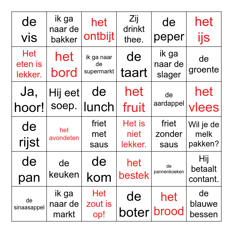 This bingo card has 36 words: het bestek, de kom, de boter, Het eten is lekker., de rijst, het fruit, het bord, Het zout is op!, de peper, de pannenkoeken, de groente, Zij drinkt thee., Hij betaalt contant., Hij eet soep., de taart, de vis, de pan, de aardappel, Ja, hoor!, het ontbijt, de lunch, het avondeten, Het is niet lekker., friet met saus, friet zonder saus, ik ga naar de bakker, ik ga naar de slager, ik ga naar de markt, ik ga naar de supermarkt, het ijs, de blauwe bessen, de sinaasappel, Wil je de melk pakken?, het vlees, de keuken and het brood.