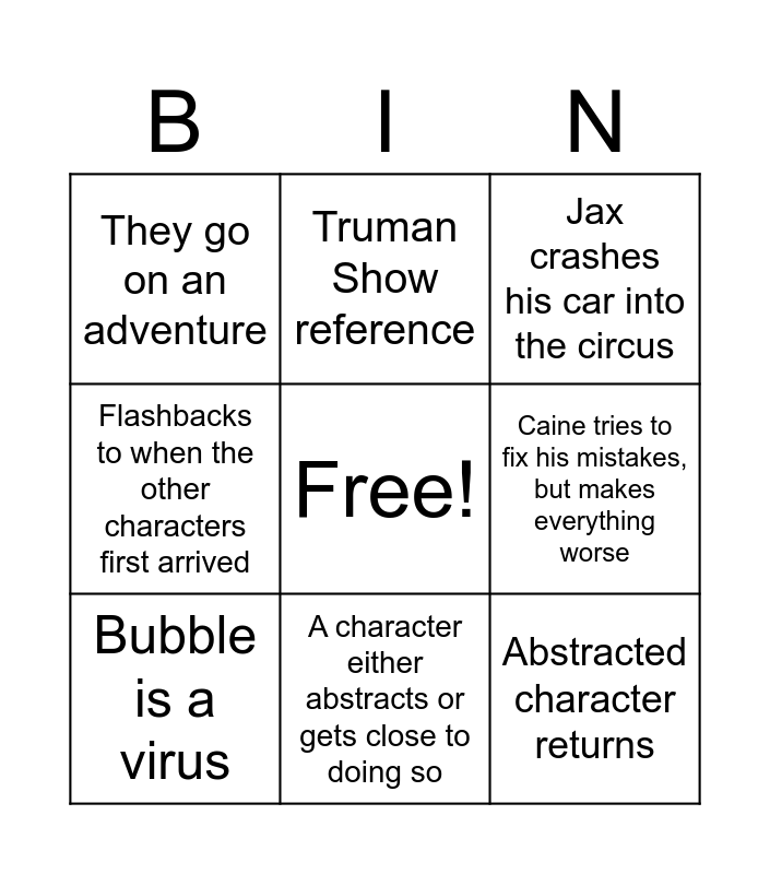 This bingo card has a free space and 8 words: Caine tries to fix his mistakes, but makes everything worse, Jax crashes his car into the circus, Truman Show reference, Bubble is a virus, They go on an adventure, Abstracted character returns, Flashbacks to when the other characters first arrived and A character either abstracts or gets close to doing so.