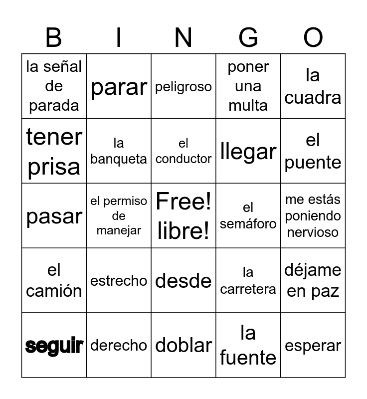 This bingo card has a free space and 36 words: la avenida, la calle, la esquina, la banqueta, la carretera, el camión, el conductor, el cruce de calles, la cuadra, el peatón, el permiso de manejar, poner una multa, el policia la policia, el semáforo, el puente, la señal de parada, ancho, estrecho, esperar, peligroso, me estás poniendo nervioso, déjame en paz, derecho, seguir, doblar, parar, pasar, quedar, llegar, tener prisa, manejar conducir, la estatua, la fuente, desde, hasta and en medio de.