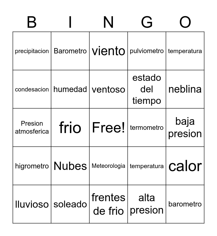 This bingo card has a free space and 24 words: Nubes, soleado, ventoso, lluvioso, temperatura, precipitacion, condesacion, Barometro, termometro, Meteorologia, estado del tiempo, Presion atmosferica, temperatura, calor, humedad, alta presion, baja presion, viento, neblina, frio, barometro, higrometro, pulviometro and frentes de frio.
