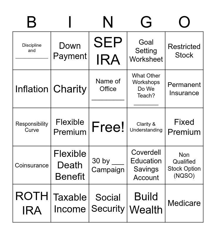 This bingo card has a free space and 66 words: Mutual Fund, The greatest asset is _________ !, Guardianship, Non Qualified Stock Option (NQSO), Instructor Name ________, The Power of Choice, Down Payment, Long Term Care, Name of Office _________, Take Action!, 30 by ___ Campaign, Insurance For Others, Fixed Premium, Restricted Stock, Guaranteed Interest Rate, Inflation, Flexible Premium, Discipline and _____________, Umbrella Policy, What Other Workshops Do We Teach?________, Flexible Death Benefit, Coinsurance, Goal Setting Worksheet, Financial Education and Financial _________, Money Manager, X Curve Concept, Assets and Liabilities, Retirement, Medicare, 401k, ROTH IRA, Tax Later, Wills and Trusts, 529 Plans, Coverdell Education Savings Account, Taxable Income, Financial Foundation, Responsibility Curve, Build Wealth, Warranty, Charity, Business Planning, Clarity & Understanding, Cost of Insurance, DIME Method, Term Insurance, Permanent Insurance, 5 Year Level Term, Accidental Death & Dismemberment, Rate Class, Cash Value, Universal life, Index Universal Life, Whole Life, Variable Life, Final Expense, Medicaid, Annuity, SEP IRA, Social Security, Dollar Cost Averaging, Risk Profile, Medical Expenses, Credit Card Debt, Debt Roll Up and Wealth Formula.