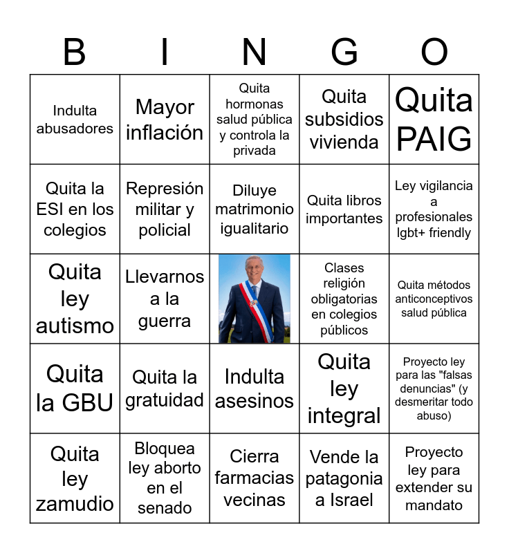 This bingo card has a free space and 24 words: Quita la gratuidad, Bloquea ley aborto en el senado, Diluye matrimonio igualitario, Quita ley zamudio, Quita PAIG, Indulta abusadores, Quita la ESI en los colegios, Mayor inflación, Clases religión obligatorias en colegios públicos, Indulta asesinos, Quita libros importantes, Quita ley autismo, Quita ley integral, Proyecto ley para las "falsas denuncias" (y desmeritar todo abuso), Represión militar y policial, Vende la patagonia a Israel, Quita métodos anticonceptivos salud pública, Quita hormonas salud pública y controla la privada, Ley vigilancia a profesionales lgbt+ friendly, Llevarnos a la guerra, Proyecto ley para extender su mandato, Quita la GBU, Quita subsidios vivienda and Cierra farmacias vecinas.