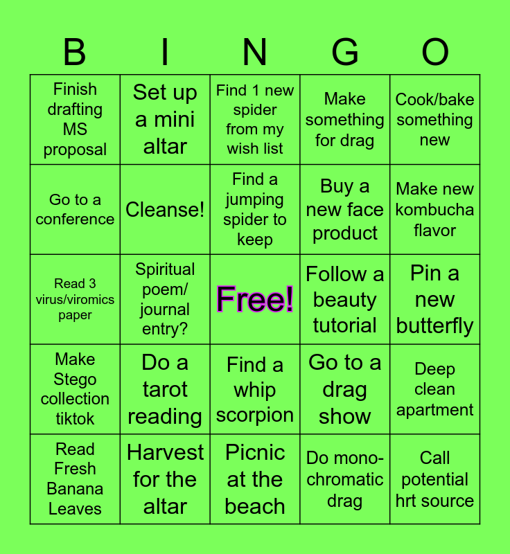 This bingo card has a free space and 24 words: Read Fresh Banana Leaves, Do a tarot reading, Find a jumping spider to keep, Do mono-chromatic drag, Cook/bake something new, Finish drafting MS proposal, Set up a mini altar, Find 1 new spider from my wish list, Follow a beauty tutorial, Pin a new butterfly, Read 3 virus/viromics paper, Cleanse!, Go to a drag show, Deep clean apartment, Go to a conference, Harvest for the altar, Picnic at the beach, Make something for drag, Make new kombucha flavor, Make Stego collection tiktok, Spiritual poem/ journal entry?, Find a whip scorpion, Buy a new face product and Call potential hrt source.