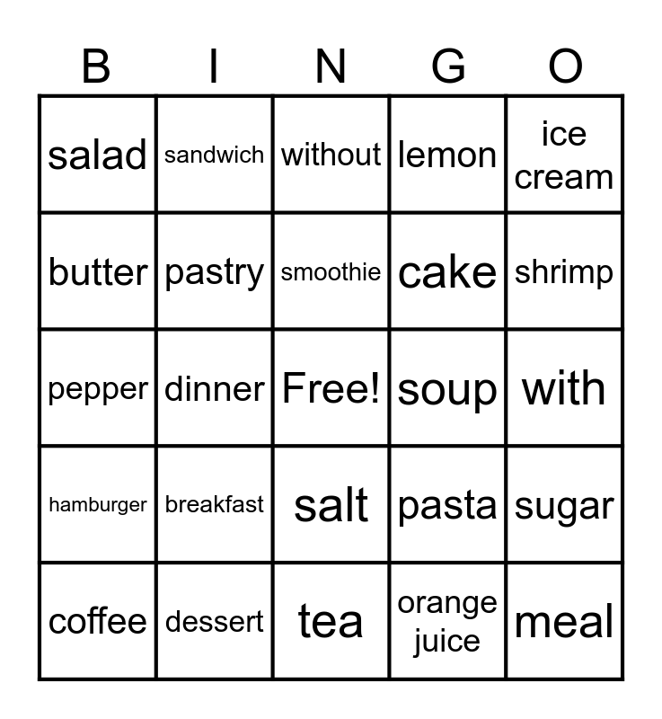 This bingo card has a free space and 24 words: breakfast, dessert, smoothie, coffee, ice cream, salad, butter, sandwich, soup, salt, cake, pepper, pasta, sugar, pastry, orange juice, with, without, shrimp, dinner, meal, hamburger, lemon and tea.