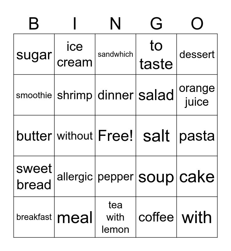 This bingo card has a free space and 24 words: allergic, meal, dinner, breakfast, dessert, sugar, smoothie, ice cream, salt, pepper, salad, butter, soup, cake, shrimp, coffee, pasta, sandwhich, orange juice, without, with, sweet bread, to taste and tea with lemon.