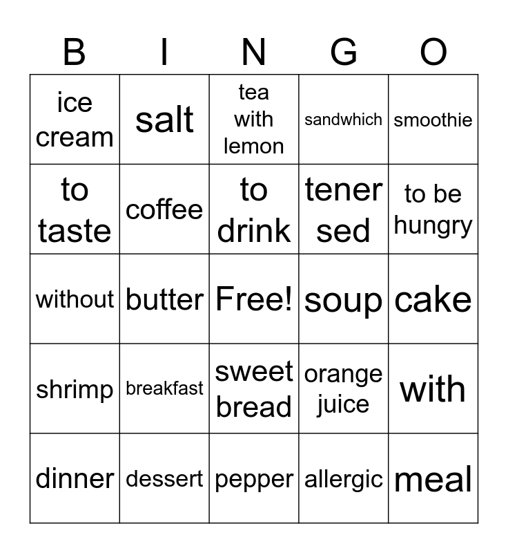 This bingo card has a free space and 24 words: breakfast, dessert, to drink, dinner, smoothie, ice cream, to taste, salt, soup, sweet bread, tener sed, without, orange juice, with, coffee, allergic, cake, tea with lemon, to be hungry, butter, meal, shrimp, sandwhich and pepper.