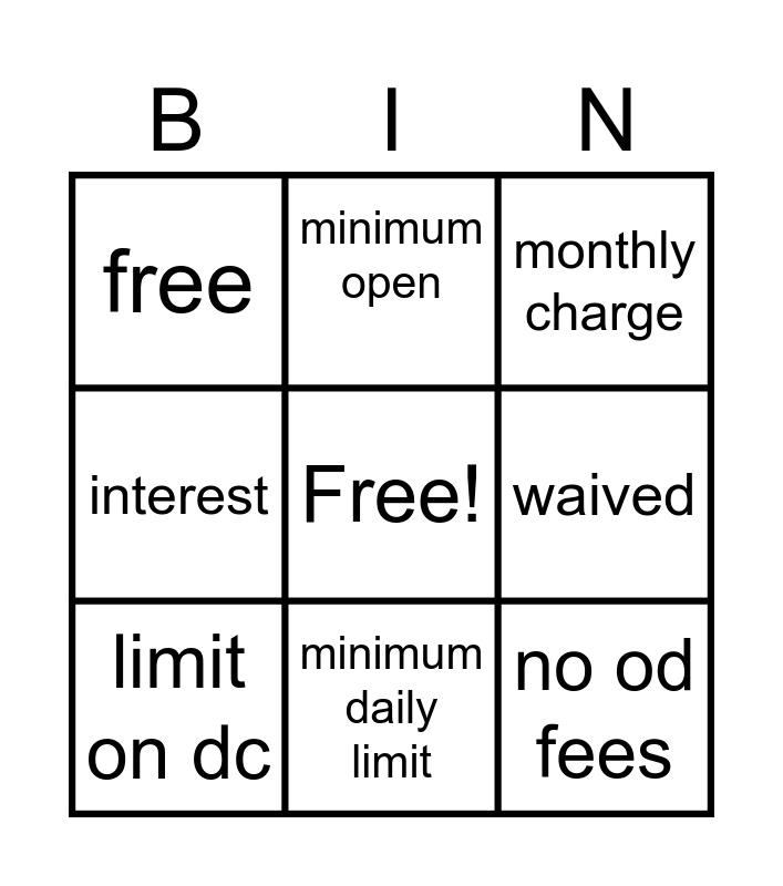 This bingo card has a free space and 9 words: limit on dc, monthly charge, minimum open, interest, free, waived, no od fees, rebated cash fees and minimum daily limit.