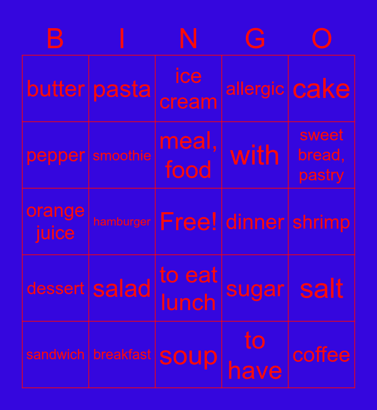 This bingo card has a free space and 24 words: sandwich, salad, meal, food, to have, cake, butter, pasta, ice cream, dinner, shrimp, orange juice, smoothie, sugar, salt, pepper, breakfast, soup, allergic, sweet bread, pastry, dessert, hamburger, to eat lunch, with and coffee.