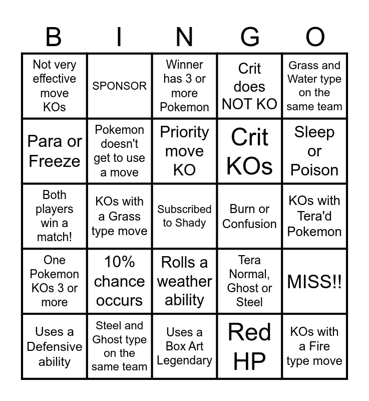 This bingo card has a free space and 24 words: 10% chance occurs, Steel and Ghost type on the same team, Priority move KO, Uses a Defensive ability, Grass and Water type on the same team, Not very effective move KOs, Para or Freeze, SPONSOR, Burn or Confusion, Rolls a weather ability, Crit KOs, Both players win a match!, Tera Normal, Ghost or Steel, MISS!!, Pokemon doesn't get to use a move, Red HP, KOs with Tera'd Pokemon, Winner has 3 or more Pokemon, Sleep or Poison, KOs with a Grass type move, KOs with a Fire type move, One Pokemon KOs 3 or more, Crit does NOT KO and Uses a Box Art Legendary.