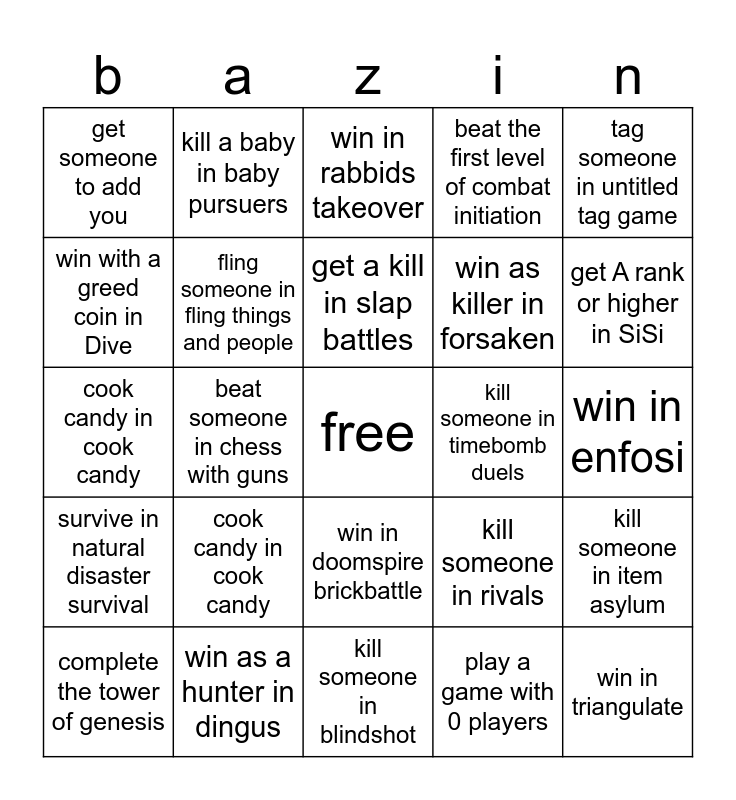 This bingo card has a free space and 24 words: cook candy in cook candy, win as a hunter in dingus, get a kill in slap battles, complete the tower of genesis, tag someone in untitled tag game, get someone to add you, win with a greed coin in Dive, kill a baby in baby pursuers, kill someone in timebomb duels, win in doomspire brickbattle, win as killer in forsaken, cook candy in cook candy, kill someone in rivals, kill someone in item asylum, fling someone in fling things and people, play a game with 0 players, win in enfosi, win in rabbids takeover, get A rank or higher in SiSi, beat someone in chess with guns, win in triangulate, survive in natural disaster survival, beat the first level of combat initiation and kill someone in blindshot.
