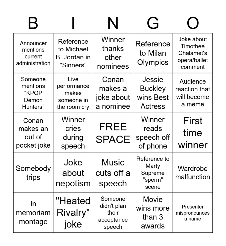 This bingo card has a free space and 26 words: Music cuts off a speech, Movie wins more than 3 awards, Conan makes a joke about a nominee, "Heated Rivalry" joke, Joke about Timothee Chalamet's opera/ballet comment, Announcer mentions current administration, Someone mentions "KPOP Demon Hunters", Reference to Michael B. Jordan in "Sinners", First time winner, Reference to Marty Supreme "sperm" scene, Jessie Buckley wins Best Actress, Conan makes an out of pocket joke, Wardrobe malfunction, In memoriam montage, Winner cries during speech, Joke about Wicked snub, Reference to Milan Olympics, Somebody trips, Winner thanks other nominees, Presenter mispronounces a name, Audience reaction that will become a meme, Someone didn't plan their acceptance speech, Winner reads speech off of phone, Joke about nepotism, Live performance makes someone in the room cry and Joke about DiCaprio dating young women.