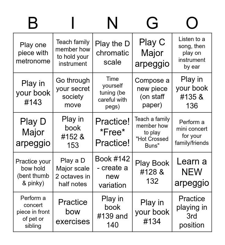 This bingo card has a free space and 24 words: Play a D Major scale 2 octaves in half notes, Practice bow exercises, Time yourself tuning (be careful with pegs), Perform a concert piece in front of pet or sibling, Listen to a song, then play on instrument by ear, Play one piece with metronome, Play in your book #143, Teach family member how to hold your instrument, Teach a family member how to play "Hot Crossed Buns", Book #142 - create a new variation, Compose a new piece (on staff paper), Play D Major arpeggio, Play Book #128 & 132, Learn a NEW arpeggio, Go through your secret society move, Play in your book #134, Perform a mini concert for your family/friends, Play the D chromatic scale, Play in your book #135 & 136, Play in book #152 & 153, Practice playing in 3rd position, Practice your bow hold (bent thumb & pinky), Play C Major arpeggio and Play in book #139 and 140.